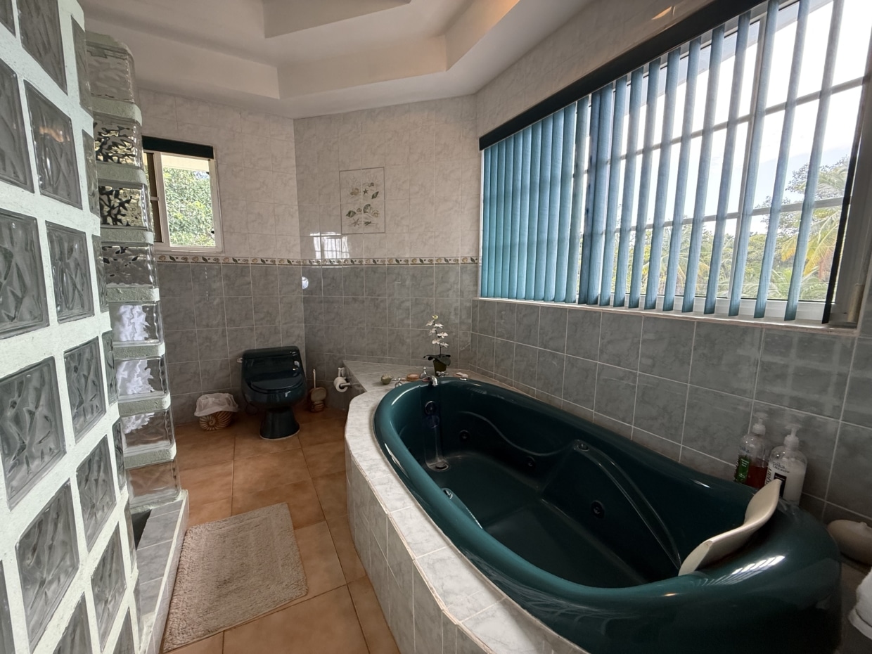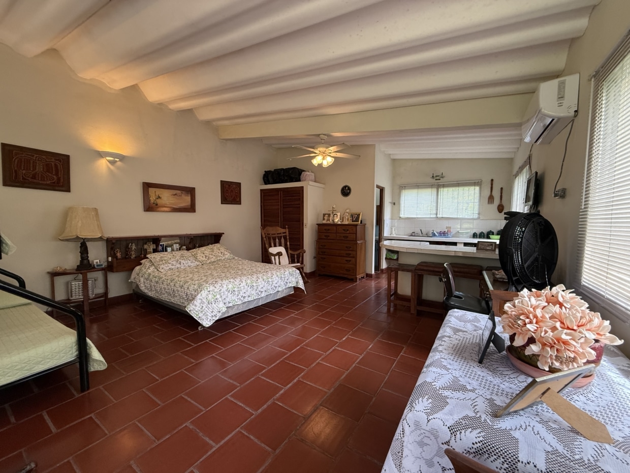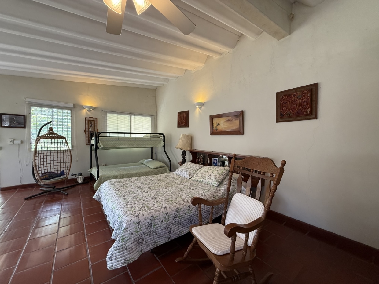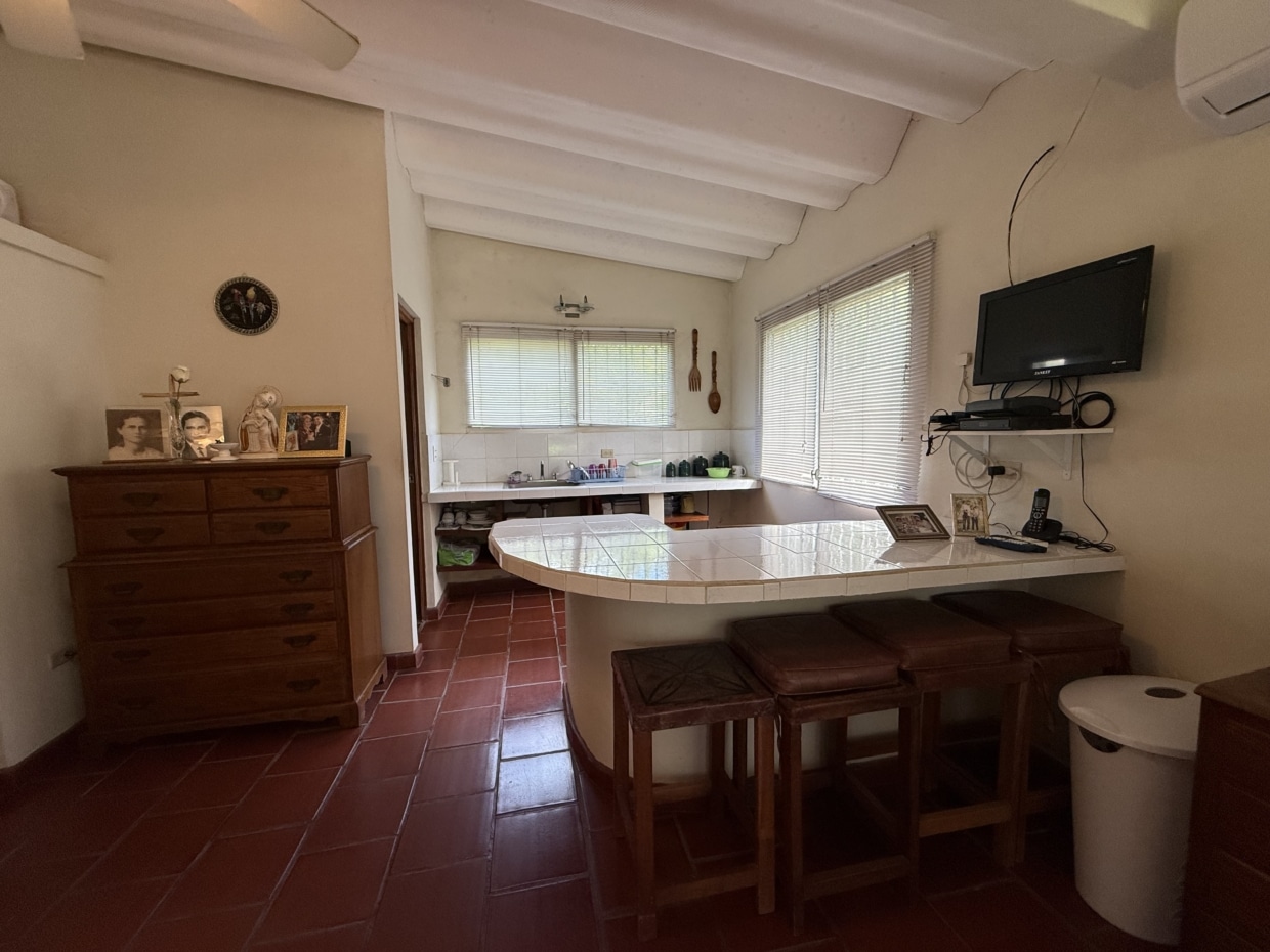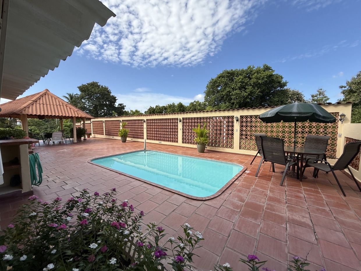 Nivel inferior: 1 habitación, estudio (convertible en habitación), 1 baño, amplia cocina, sala-comedor y terraza con acceso directo a la piscina y bohío.