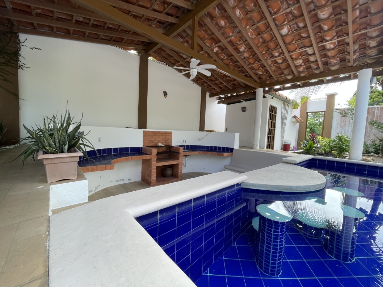 Piscina privada con bar integrado y área de BBQ, ideal para reuniones y eventos al aire libre.
