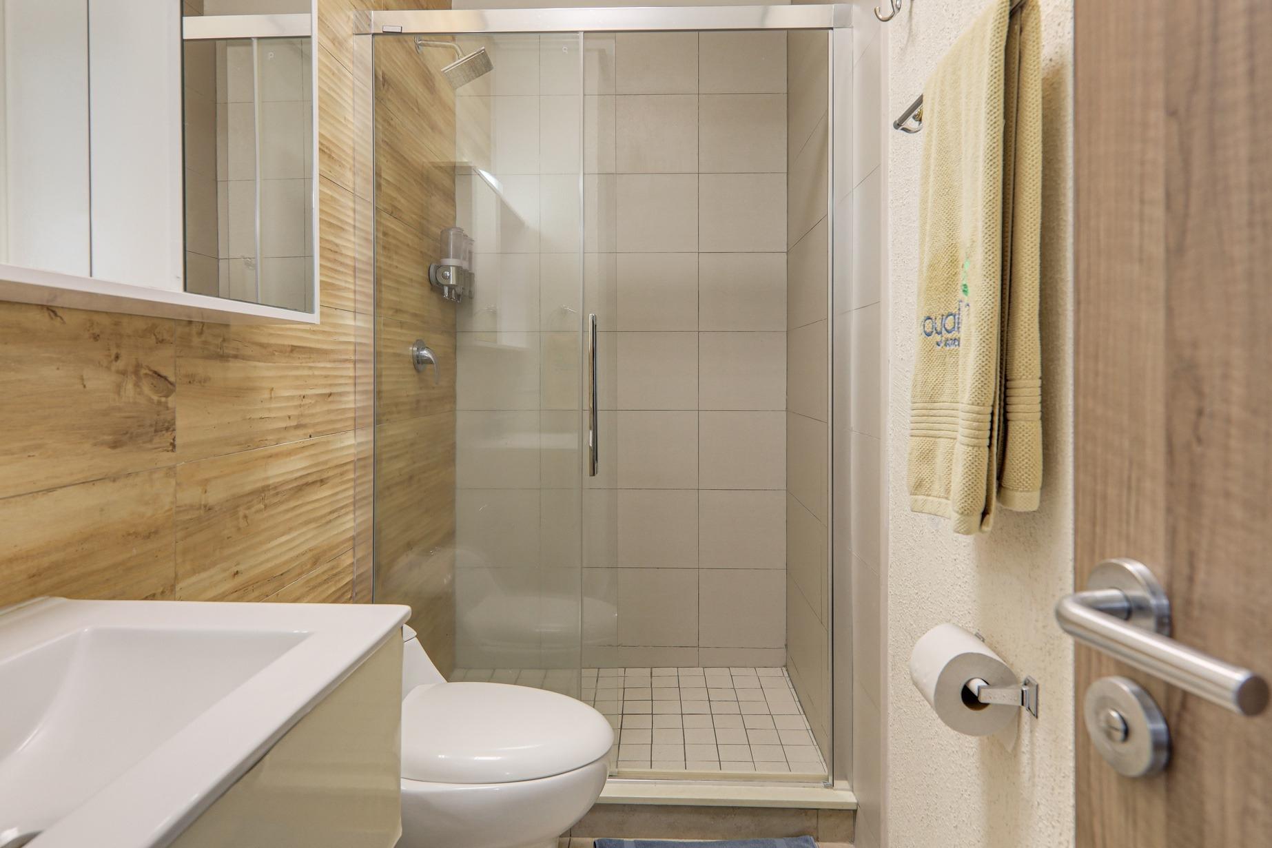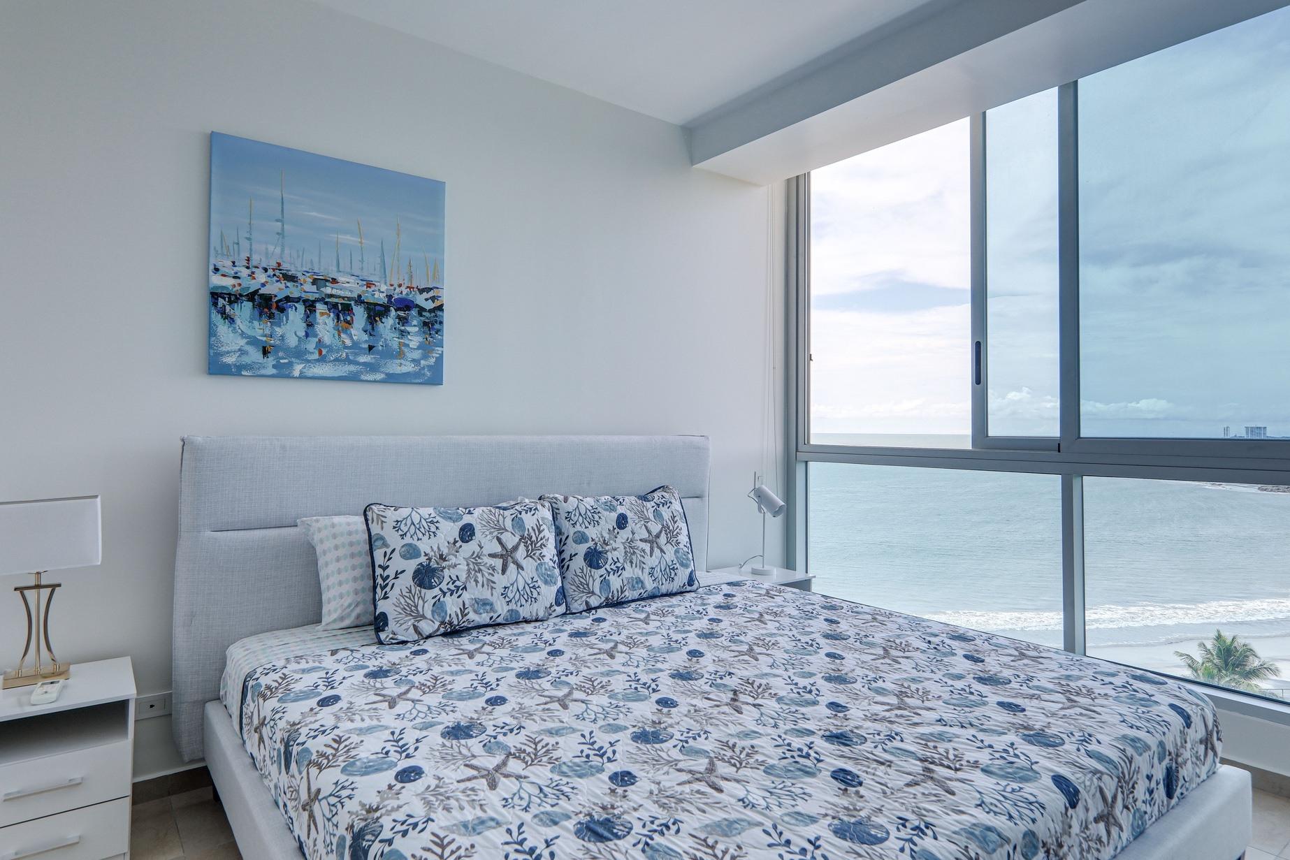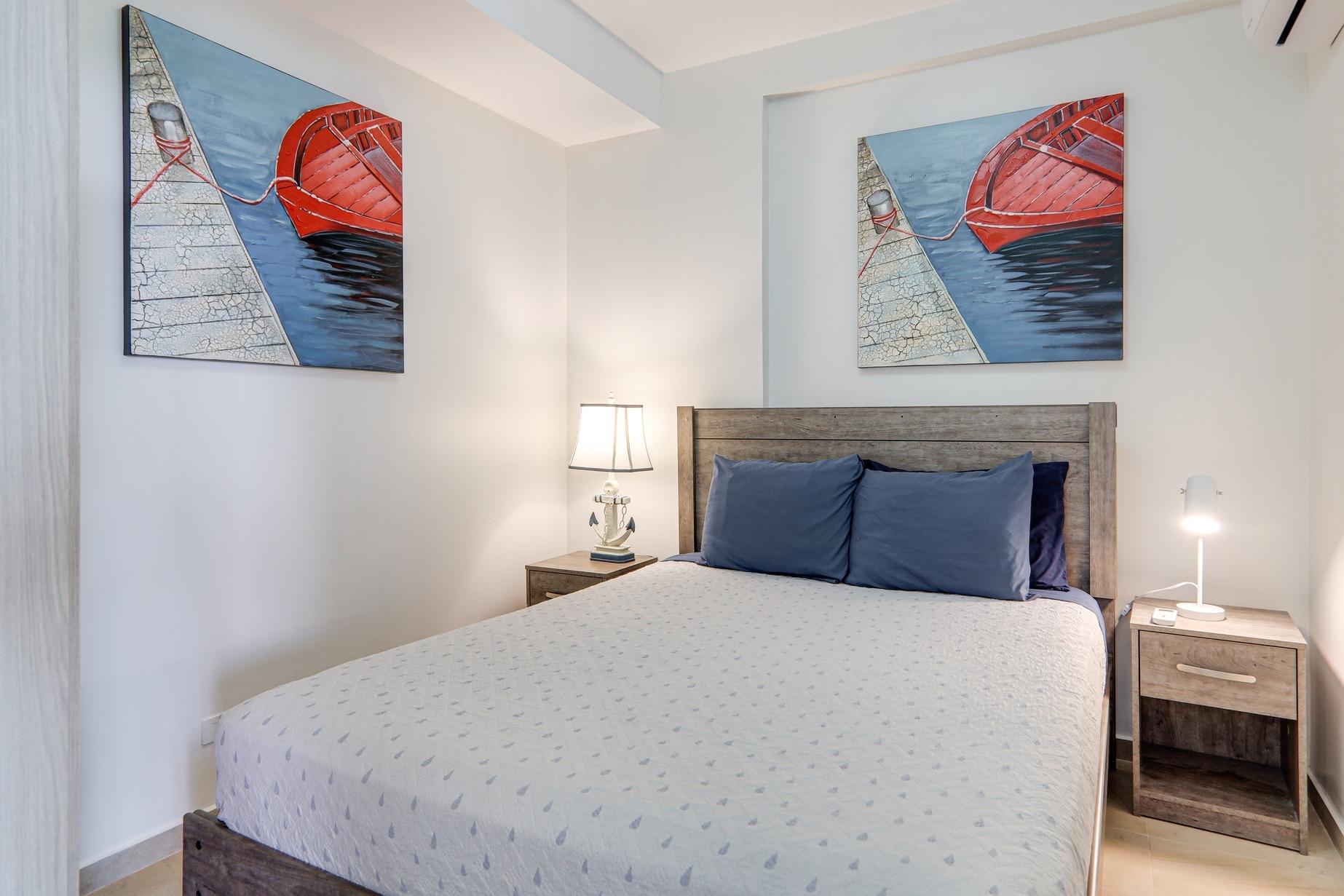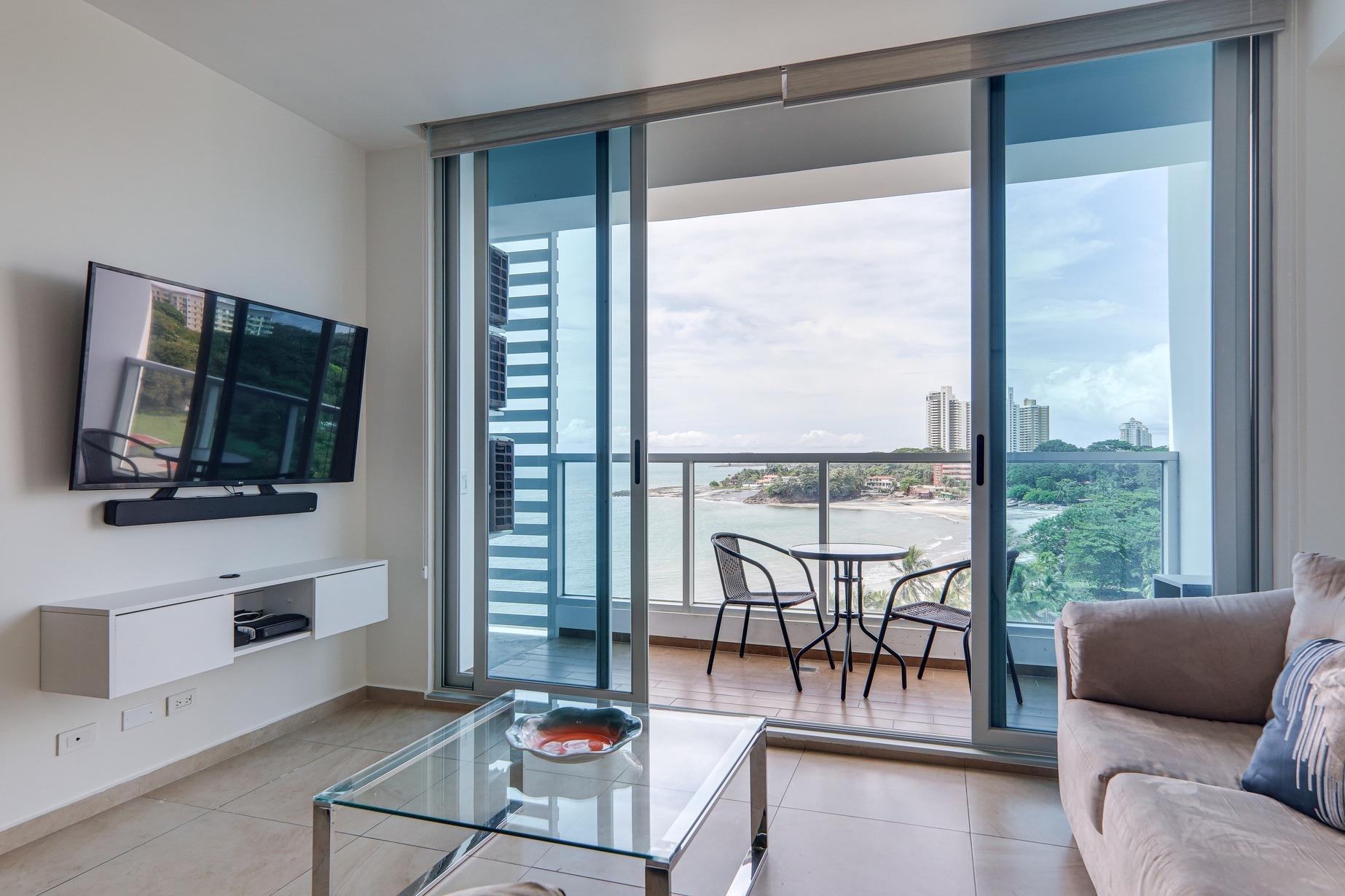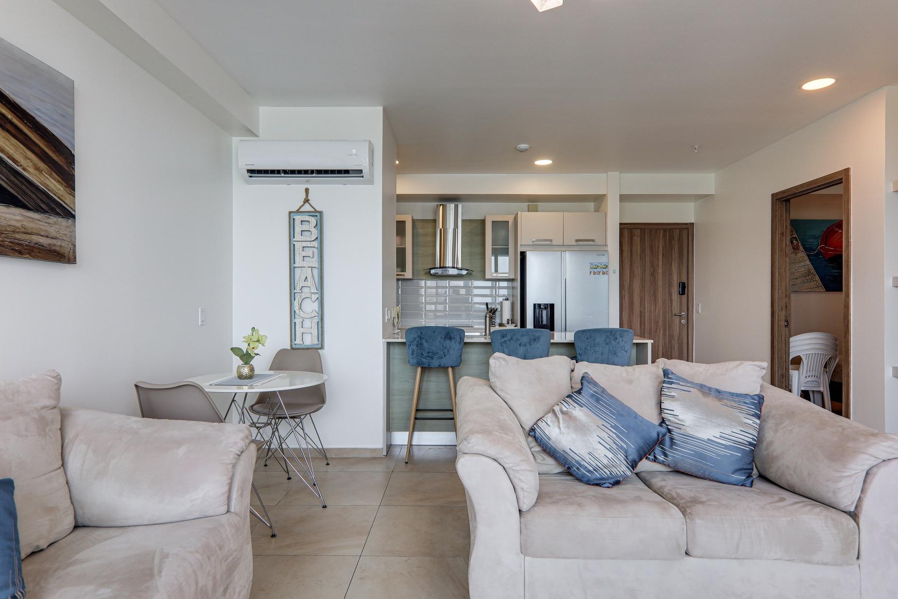 Las características de este apartamento incluyen: 70 m2 de construcción Impresionantes vistas hacia la tranquila caleta de pescadores y el Océano Pacífico desde la sala-comedor y recámara principal Balcón con paneles de vidrio Cocina abierta con línea blanca de acero inoxidable Recámara principal con cama king Segunda recámara con cama queen Baño externo completo Lavandería privada con calentador de agua a demanda Un estacionamiento asignado Cuota de mantenimiento muy baja, de solo $140/mes e incluye agua y aseo