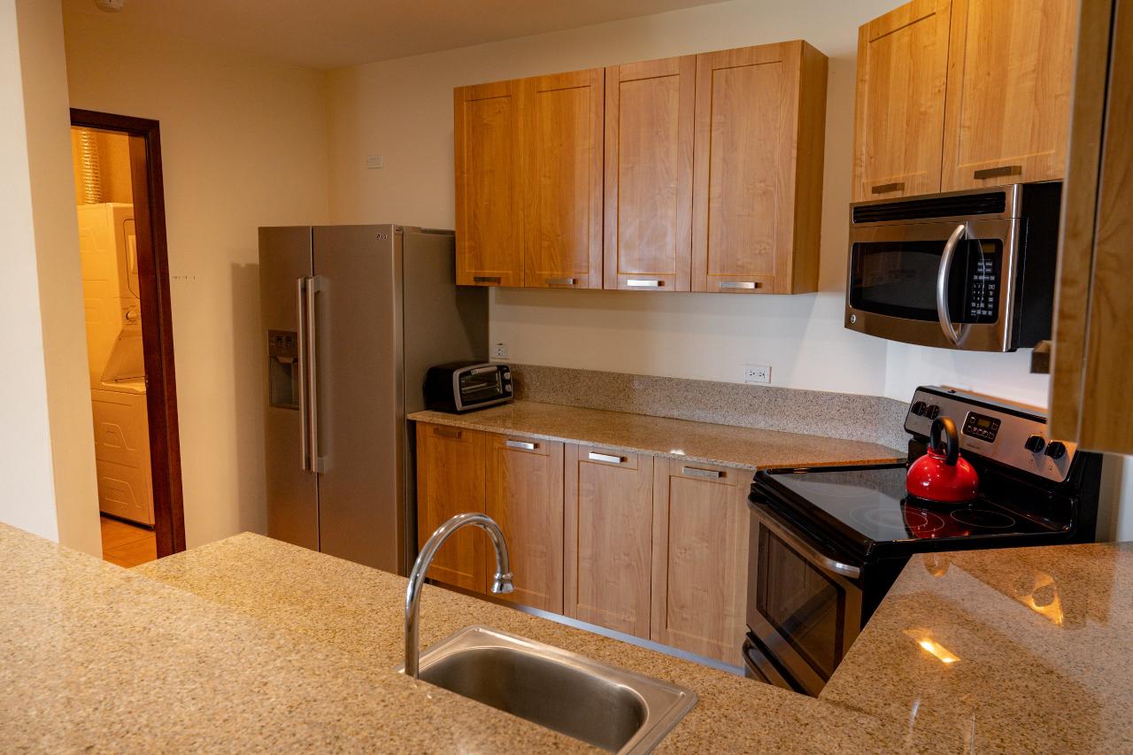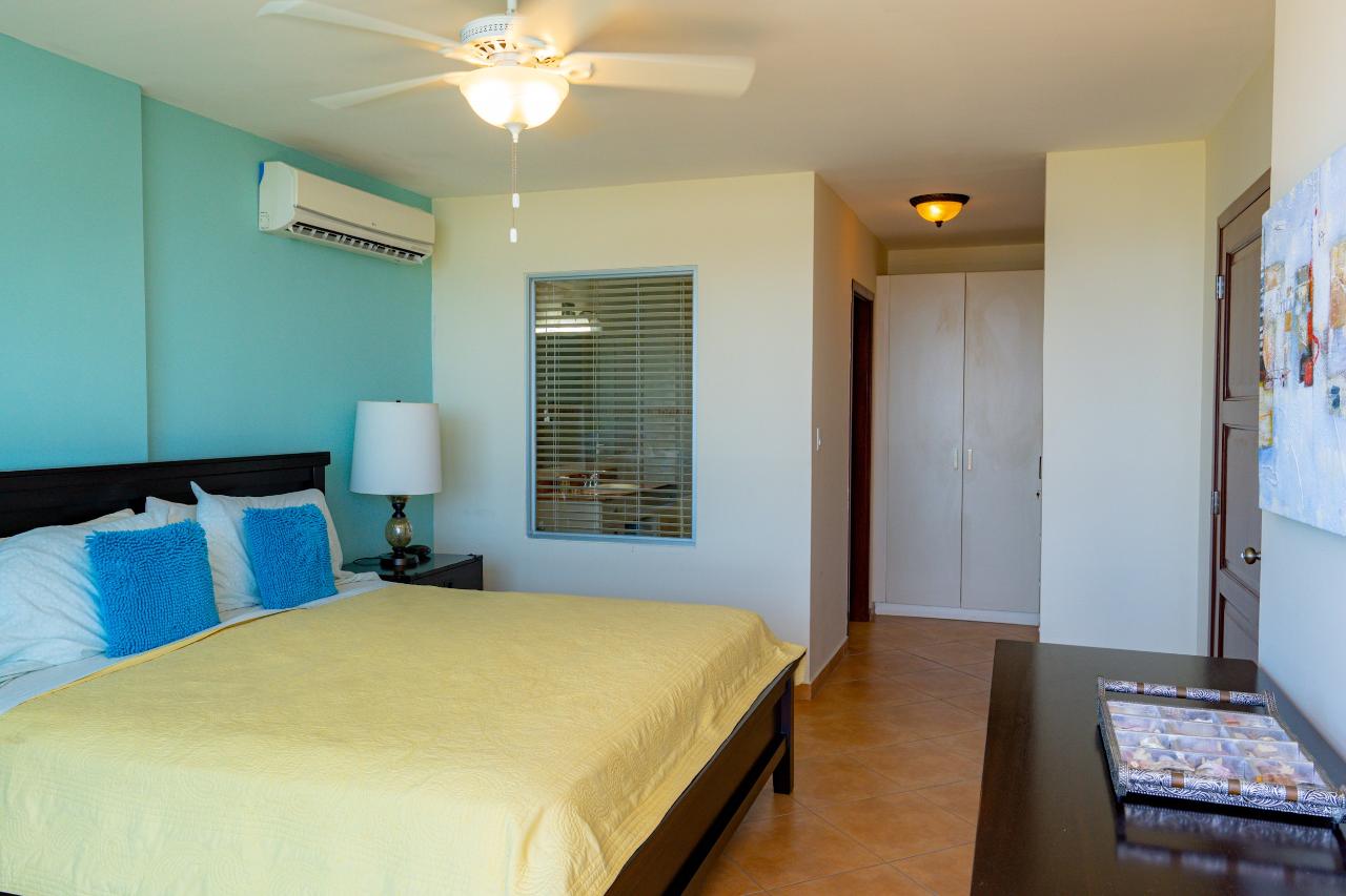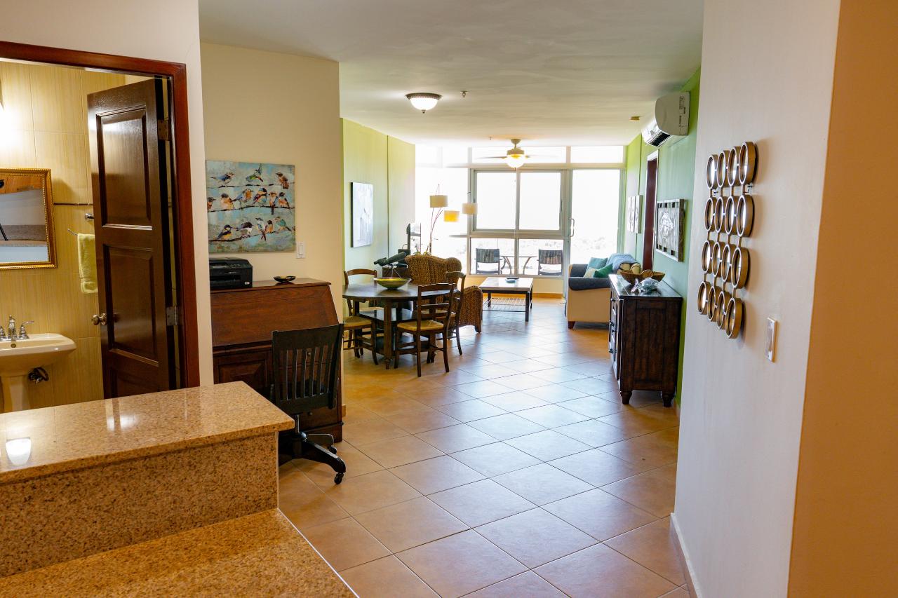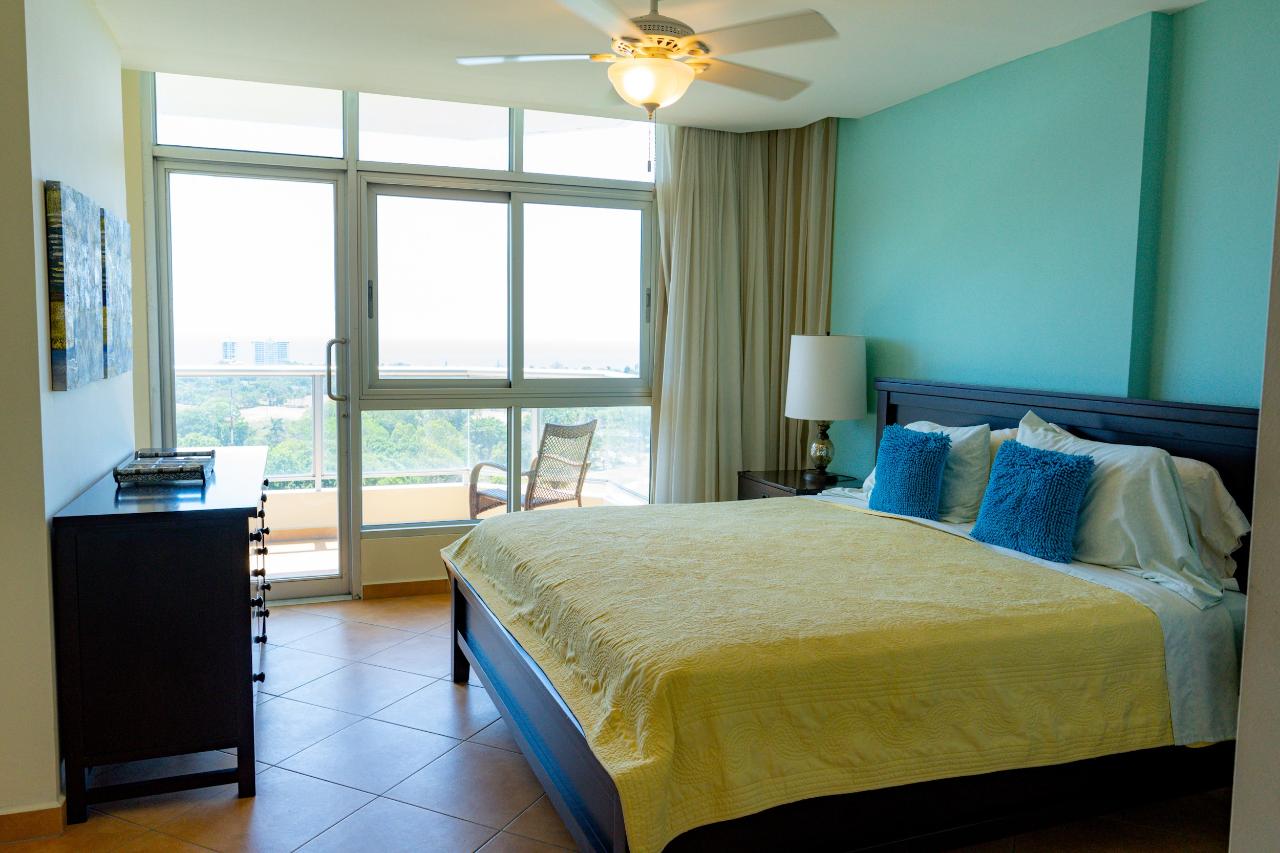 Este apartamento en el piso 15 ubicado en Coronado Golf Tower ofrece amplias vistas al campo de golf del Océano Pacífico durante la temporada de tormentas y amaneceres tranquilos en el verano tropical desde la habitación principal, el dormitorio y el amplio balcón sin obstrucciones. El apartamento ofrece las siguientes amenidades: Gran sala espaciosa con impresionantes vistas al Océano Pacífico y al campo de golf, cómodo sofá, sillón de ala de ratán, mesa de café, unidad de entretenimiento para el televisor y un amplio comedor con una mesa redonda para 4 sombrillas en el amplias ventanas Combinación de colores de buen gusto en toda la cocina Cocina totalmente equipada con encimeras de granito, lavaplatos, refrigerador, estufa, microondas, armario de lavandería con fregadero y centro de lavado Lavadora/secadora Dormitorio principal espacioso con una cama tamaño King La suite principal tiene un vestidor closet y baño privado con ducha grande y tina de inmersión Cortinas black-out en la recámara. Amplio balcón con vistas a la montaña, al campo de golf y al mar
