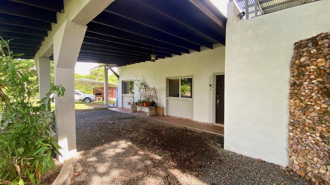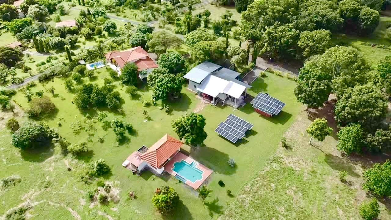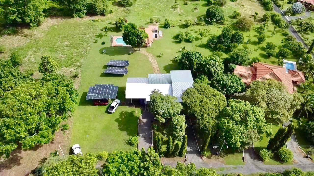 Casa de tres dormitorios con sistema completo de energía solar, una linda piscina y un amplio terreno ajardinado, a solo 10 minutos de Coronado. Esta casa de tres dormitorios con energía solar se encuentra en el complejo Las Quintas de Cabuya, camino al pueblo de Cabuya. Es un complejo muy acogedor con aproximadamente 20 casas, rodeado de montañas. Ofrece vistas preciosas y una agradable brisa durante todo el año. Tiene una pequeña área social con piscina y bohíos de penca. LA CASA Esta casa de tres dormitorios con energía solar tiene un estilo colonial. Los techos son muy altos y hechos de madera maciza oscura. La construcción data de 2014. Con una superficie aproximada de 200m2 y 3400m2 de jardín con abundantes árboles frutales, esta propiedad goza de una ubicación privilegiada, al final de una calle sin salida. • Amplio salón con acceso a la terraza. • Cocina abierta, amueblada y equipada, con comedor. • Primer dormitorio con baño privado y entrepiso, aire acondicionado y ventilador de techo. • Segundo dormitorio, también con baño privado, aire acondicionado y ventilador de techo. • Tercer dormitorio, aire acondicionado y ventilador de techo. • Baño independiente con sanitario. • Terraza cubierta con vistas al patio trasero, la piscina y las montañas circundantes. • Baño exterior, lateral a la terraza. • Piscina y amplio bohío con cocina exterior, horno de ladrillo, baño completo y amplio almacén. • Lavandería. • Deposito de jardín. • Mirador de 60 metros cuadrados con agua y electricidad. • Amplias plazas de aparcamiento. • Contenedor refrigerado y aislado de 20 pies con sistema solar, baterías y controles. El jardín de 3400 metros cuadrados está completamente ajardinado, con árboles frutales (papaya, piña, mango, plátano, coco, guanábana, limón, naranja y mandarina). Las vistas son despejadas y ofrecen linda vistas de las montañas circundantes. Además, una agradable brisa recorre la propiedad durante todo el año. Esta casa de tres dormitorios, de estilo colonial y con sistema solar, es una excelente opción para quienes buscan una vivienda autosuficiente, con espacio suficiente para toda la familia en un vecindario tranquilo y seguro. El sistema solar es muy eficiente, con una gran capacidad de almacenamiento de energía. La casa le seducirá por su distribución funcional, sus altos techos de madera estilo catedral, su estado general y la tranquilidad del lugar. Además, se beneficiará de una exención del impuesto predial hasta el 2034.