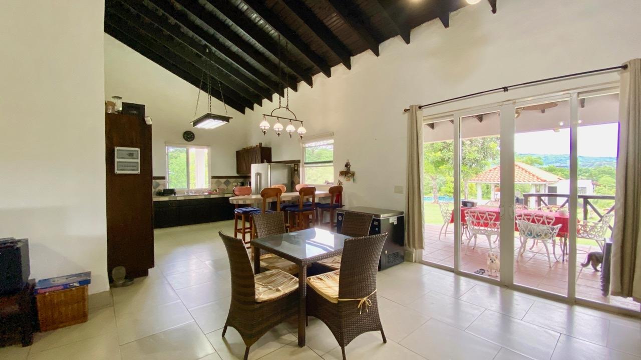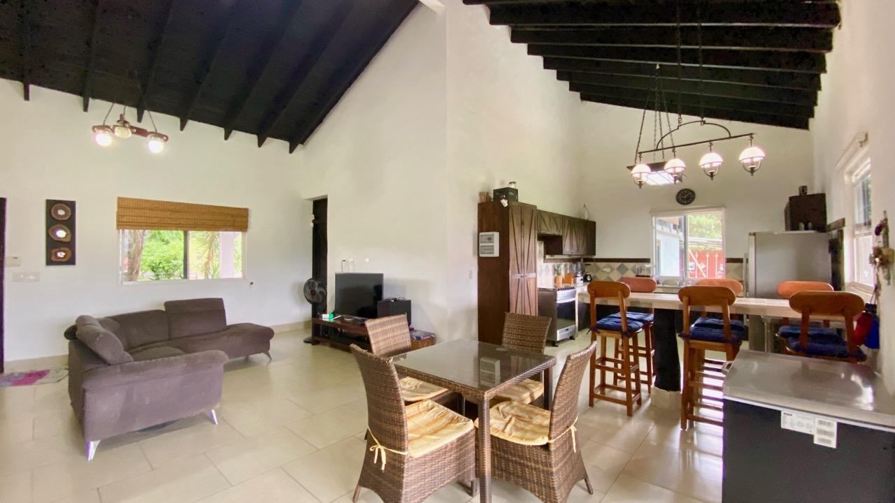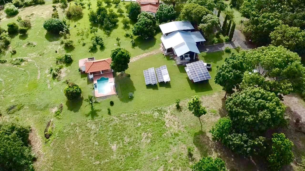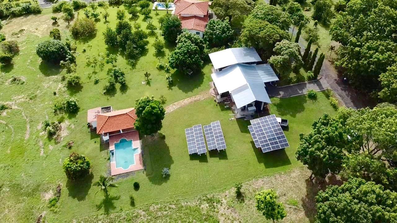 Casa de tres dormitorios con sistema completo de energía solar, una linda piscina y un amplio terreno ajardinado, a solo 10 minutos de Coronado. Esta casa de tres dormitorios con energía solar se encuentra en el complejo Las Quintas de Cabuya, camino al pueblo de Cabuya. Es un complejo muy acogedor con aproximadamente 20 casas, rodeado de montañas. Ofrece vistas preciosas y una agradable brisa durante todo el año. Tiene una pequeña área social con piscina y bohíos de penca. LA CASA Esta casa de tres dormitorios con energía solar tiene un estilo colonial. Los techos son muy altos y hechos de madera maciza oscura. La construcción data de 2014. Con una superficie aproximada de 200m2 y 3400m2 de jardín con abundantes árboles frutales, esta propiedad goza de una ubicación privilegiada, al final de una calle sin salida. • Amplio salón con acceso a la terraza. • Cocina abierta, amueblada y equipada, con comedor. • Primer dormitorio con baño privado y entrepiso, aire acondicionado y ventilador de techo. • Segundo dormitorio, también con baño privado, aire acondicionado y ventilador de techo. • Tercer dormitorio, aire acondicionado y ventilador de techo. • Baño independiente con sanitario. • Terraza cubierta con vistas al patio trasero, la piscina y las montañas circundantes. • Baño exterior, lateral a la terraza. • Piscina y amplio bohío con cocina exterior, horno de ladrillo, baño completo y amplio almacén. • Lavandería. • Deposito de jardín. • Mirador de 60 metros cuadrados con agua y electricidad. • Amplias plazas de aparcamiento. • Contenedor refrigerado y aislado de 20 pies con sistema solar, baterías y controles. El jardín de 3400 metros cuadrados está completamente ajardinado, con árboles frutales (papaya, piña, mango, plátano, coco, guanábana, limón, naranja y mandarina). Las vistas son despejadas y ofrecen linda vistas de las montañas circundantes. Además, una agradable brisa recorre la propiedad durante todo el año. Esta casa de tres dormitorios, de estilo colonial y con sistema solar, es una excelente opción para quienes buscan una vivienda autosuficiente, con espacio suficiente para toda la familia en un vecindario tranquilo y seguro. El sistema solar es muy eficiente, con una gran capacidad de almacenamiento de energía. La casa le seducirá por su distribución funcional, sus altos techos de madera estilo catedral, su estado general y la tranquilidad del lugar. Además, se beneficiará de una exención del impuesto predial hasta el 2034.