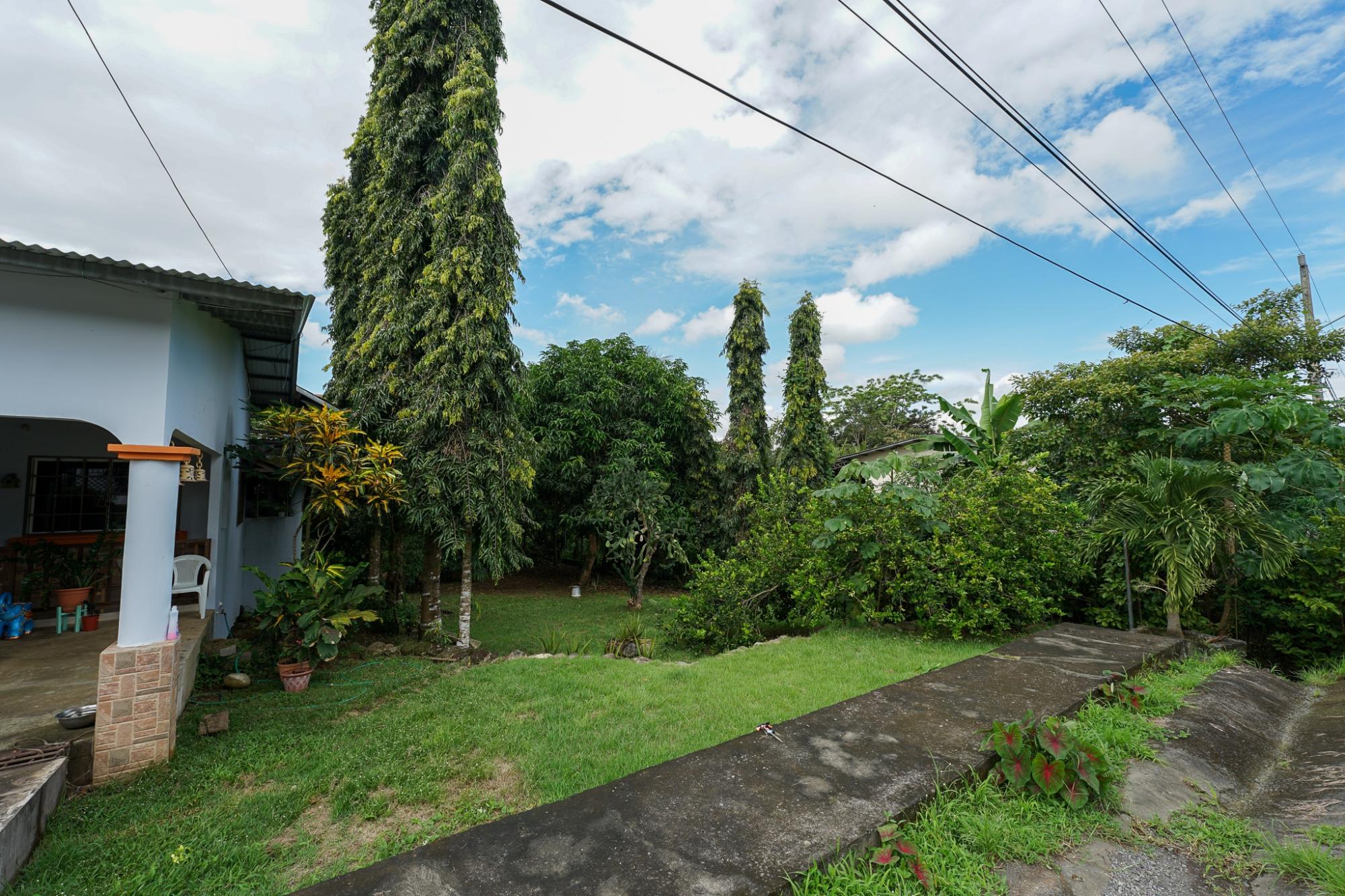 En la parte delantera de la propiedad, hay una zona de aparcamiento cubierto para un vehículo y un pequeño porche. En el interior, una amplia sala de estar y comedor se conecta con la cocina, parcialmente separada por una barra americana. La propiedad se vende con electrodomésticos, incluyendo estufa, microondas y horno. El dormitorio principal cuenta con baño en suite con bañera. Los dos dormitorios secundarios comparten un baño completo. El aire acondicionado enfría todas las habitaciones y zonas comunes. La casa también incluye una terraza trasera cubierta y un patio pavimentado. El jardín, con plantas ornamentales y árboles frutales, ofrece un espacio exterior ideal para disfrutar, con potencial para una mayor jardinería. La venta incluye todos los equipos de aire acondicionado, electrodomésticos de cocina y un sistema de seguridad instalado.