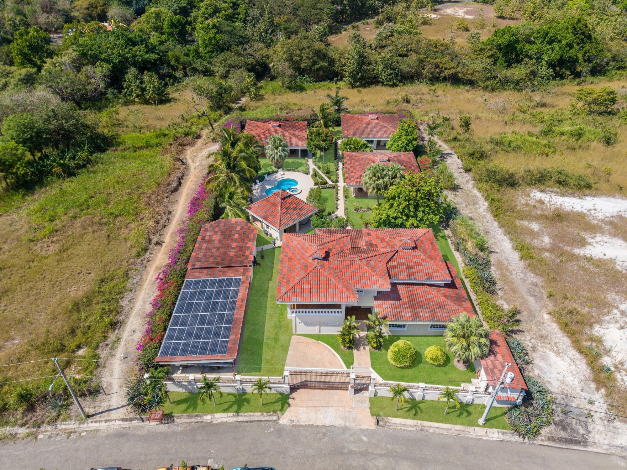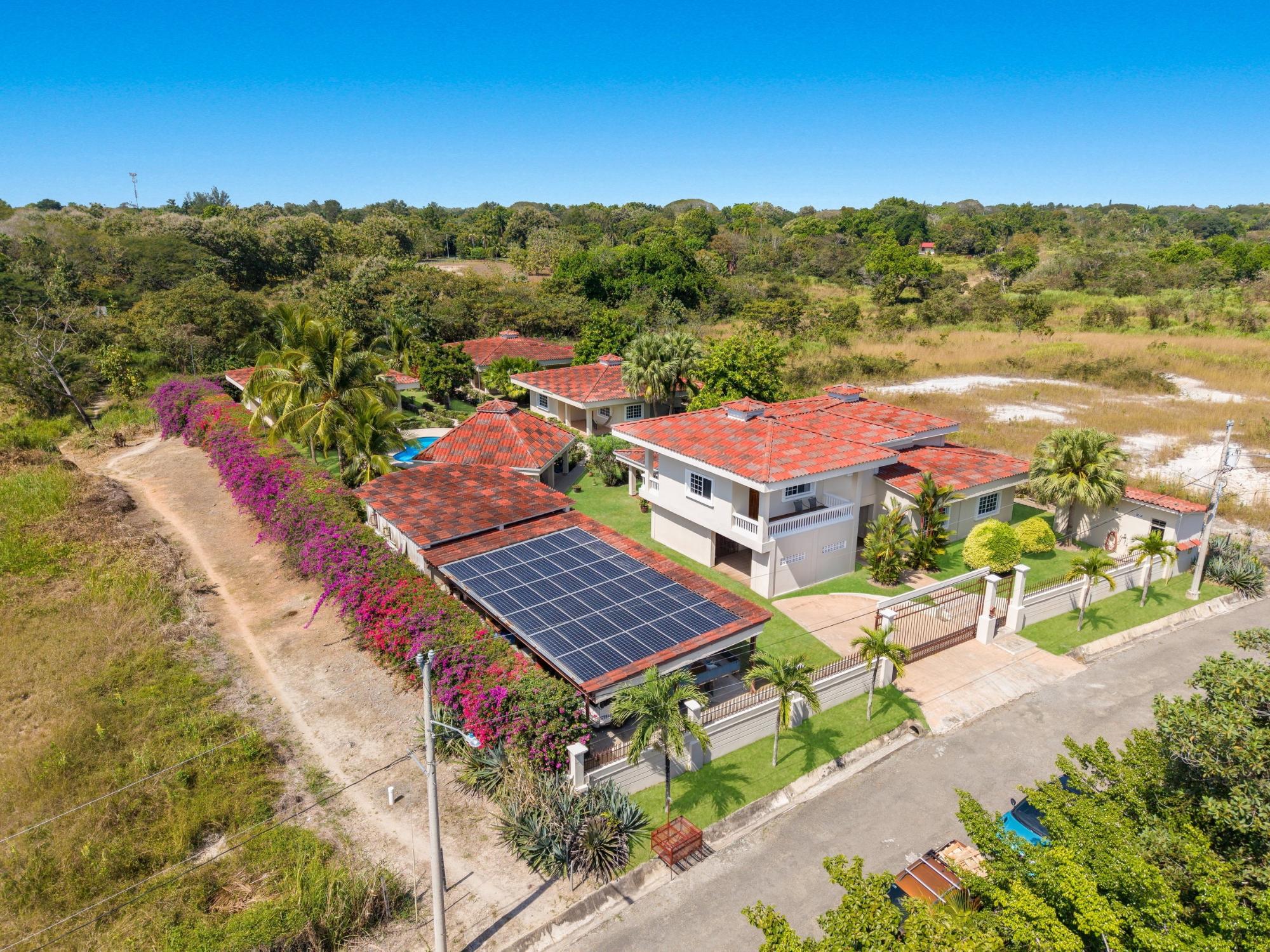 Descubre tu hogar soñado en Santa Clara, Río Hato: una propiedad que combina perfectamente el lujo moderno, el confort y la belleza natural de la Costa Pacífica de Panamá. Esta impresionante casa ofrece amplios interiores, acabados elegantes y espacios exteriores expansivos, lo que la convierte en el lugar ideal para relajantes escapadas familiares o para organizar reuniones inolvidables. Ubicada a solo minutos de la playa, esta propiedad promete un estilo de vida de tranquilidad y exclusividad. La propiedad cuenta con un área total de terreno de 3,033 m² y una casa principal de 380 m², totalmente amoblada y equipada. La casa principal tiene 3 dormitorios, 3.5 baños, un den, sala de estar, cocina y oficina. El área común incluye un gazebo con parrilla, nevera, fregadero y una amplia zona de asientos, así como una piscina con duchas exteriores y baño. Además, la propiedad incluye tres casas de huéspedes, cada una de 118 m², amobladas y equipadas con 2 dormitorios, 2 baños, sala y cocina. La construcción está realizada con cemento, concreto y paneles M2, lo que proporciona un excelente aislamiento, mínimo mantenimiento y una estructura robusta. La propiedad está equipada con paneles solares que abastecen de energía a la casa principal y las áreas comunes, eliminando los costos de electricidad. El sistema solar también puede suministrar energía a las casas de huéspedes si es necesario. Cada casa, incluidas las casas de huéspedes y las áreas comunes, tiene su propio medidor de electricidad. La propiedad también cuenta con un pozo de agua privado con sistema de riego, un sistema de drenaje integral y un sistema de seguridad instalado en toda la propiedad. Además, dispone de un generador eléctrico, internet de alta velocidad por fibra óptica con Tigo y bombas de agua a presión y de pozo. La comunidad es una zona residencial privada con una sinagoga, ubicada a poca distancia de una playa aislada de arena blanca y aguas cristalinas. Esta propiedad combina comodidad, eficiencia y comodidades modernas dentro de un entorno pacífico y privado, lo que la convierte en el retiro familiar ideal en la tranquila localidad de Santa Clara.
