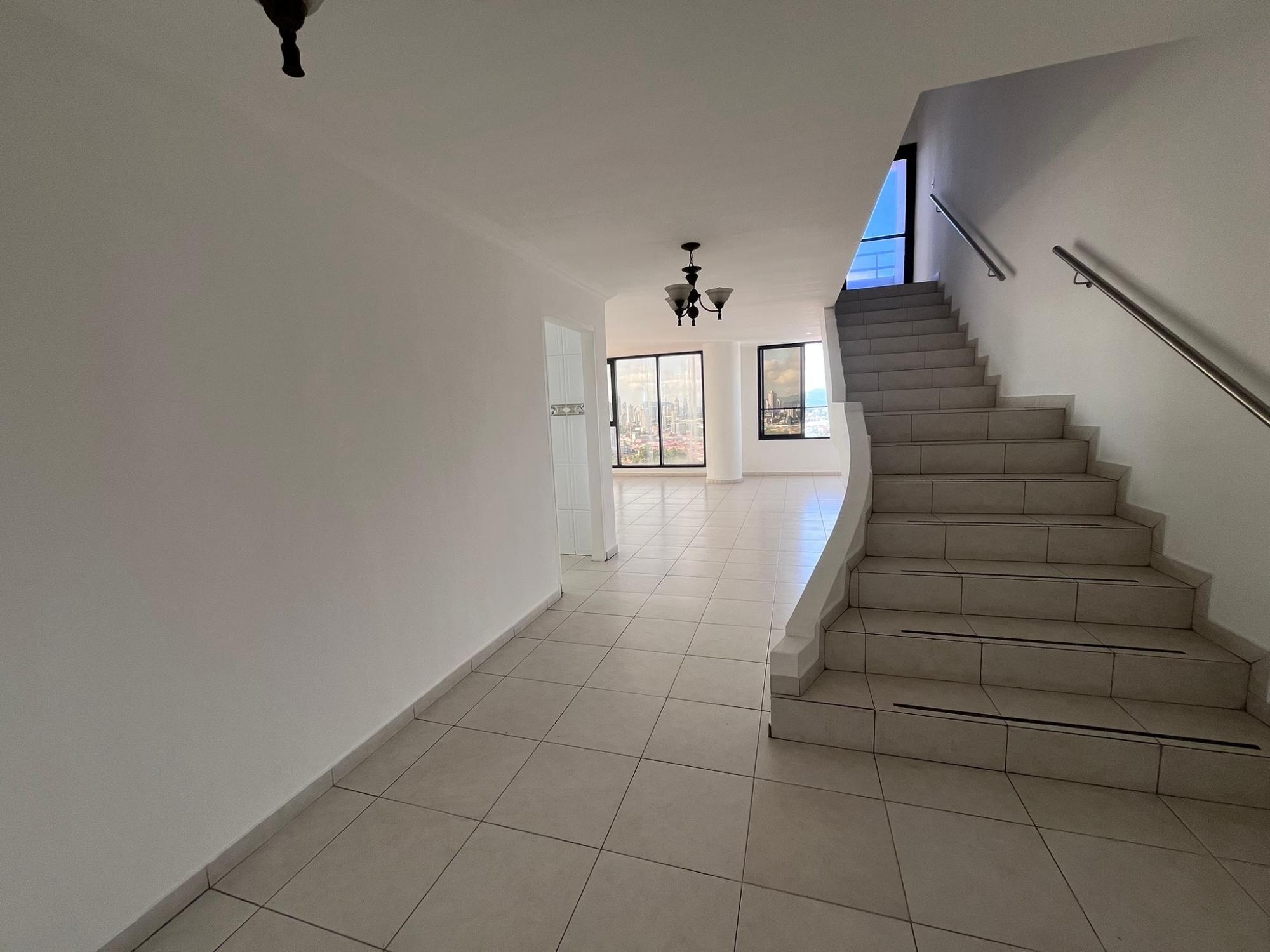 Este espectacular penthouse de dos pisos ubicado en Hato Pintado, PH Sky View, ofrece una combinación perfecta de amplitud, confort y vistas incomparables de la ciudad de Panamá. Con 335 m² de construcción, cuenta con 4 recámaras, 3 baños completos, medio baño de visitas y 4 estacionamientos, ideal para familias que buscan espacio, privacidad y una ubicación céntrica. La planta baja incluye vestíbulo, sala, comedor, cocina, tres recámaras y dos servicios sanitarios y medio. La planta alta consta de cuarto de empleada, balcón, lavandería, una recámara y dos servicios sanitarios, brindando una distribución funcional y bien pensada para separar las áreas sociales de las privadas. Uno de sus mayores atractivos son las impresionantes vistas panorámicas hacia la ciudad, donde destacan el Cerro Ancón y el Parque Metropolitano, creando una sensación única de conexión con la naturaleza en medio del entorno urbano.