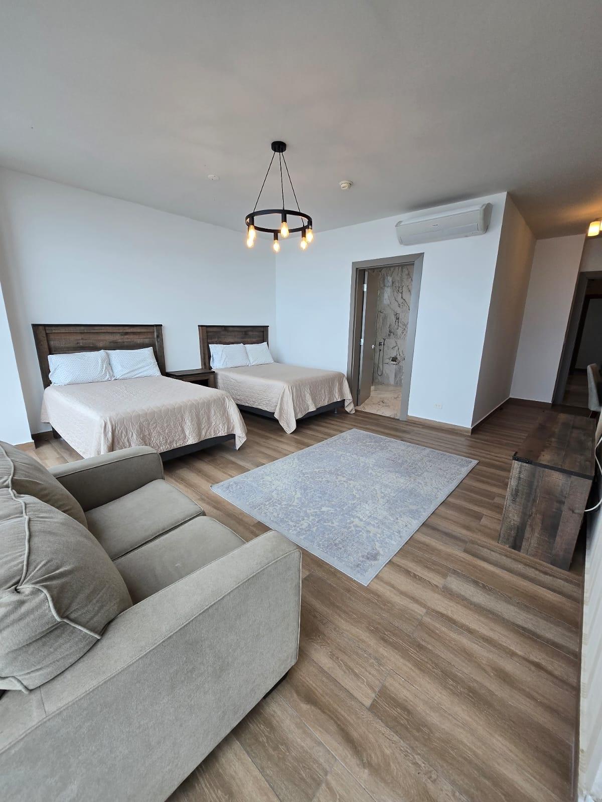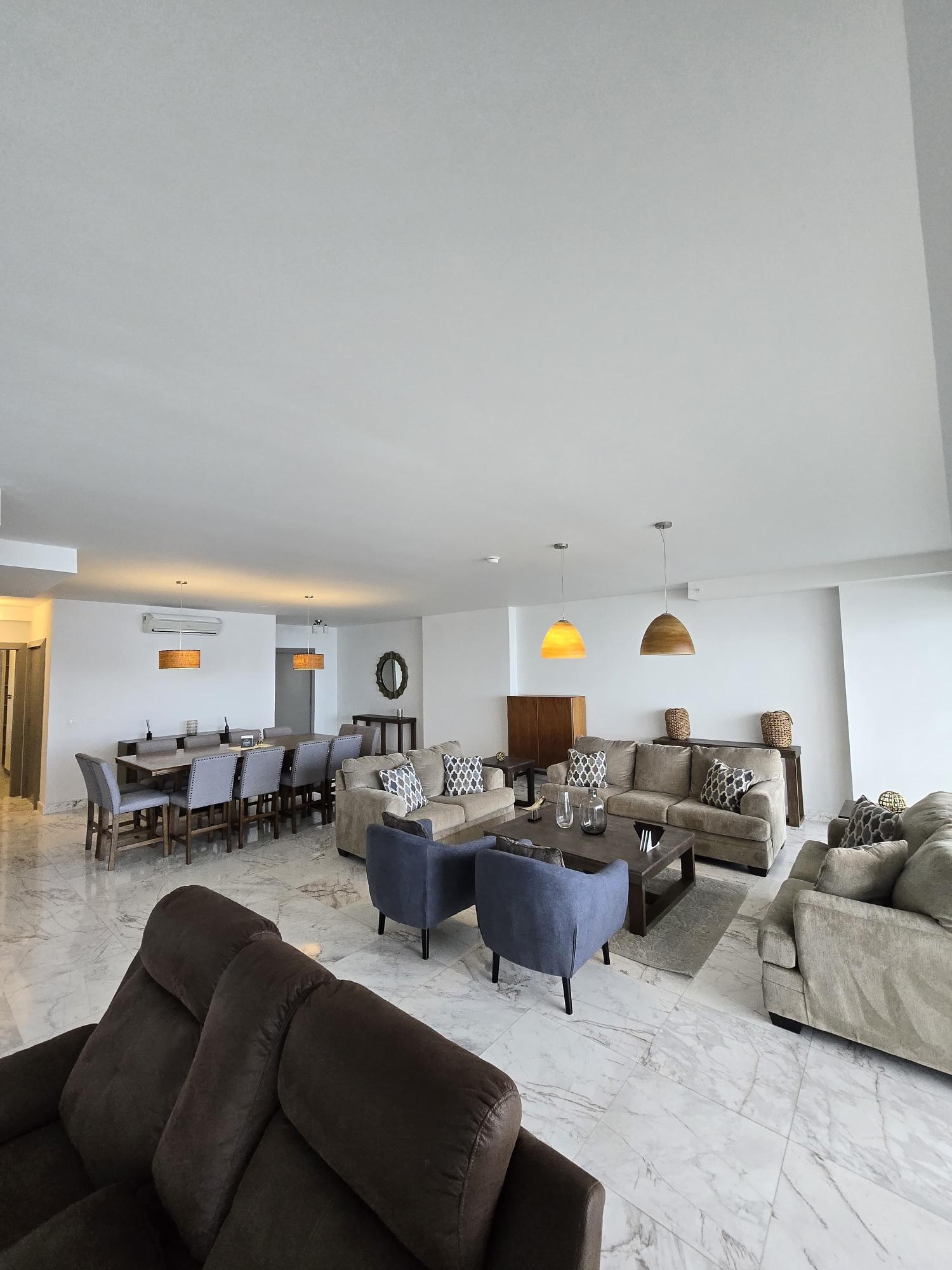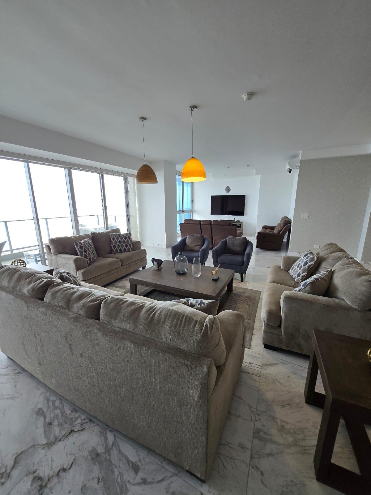 espectacular apartamento con vista al mar directa y vista a la ciudad, en lujoso edificio con pocos años de construccion, amoblado, con area social lujosa y en la mejor zona de panama, piso alto y doble altura