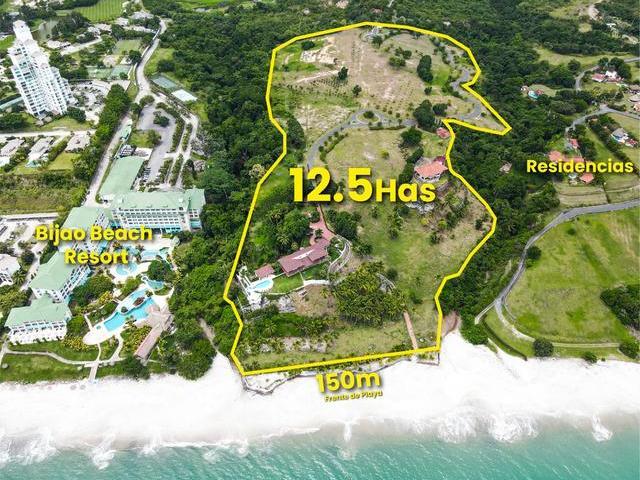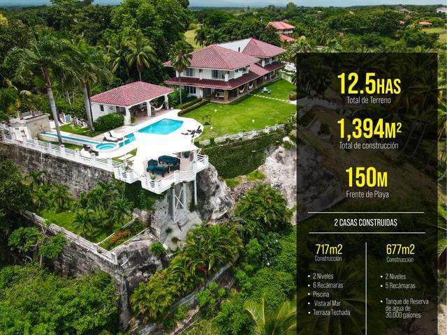 Propiedad ideal para Desarrollo de Hotel o Urb. Residencial Privada de Playa frente a las playas del Pacífico. Es un globo de terreno de 12.5 Hectáreas con 150m frente al mar. Tiene una garita de acceso, carretera interna de grava, con toda la electricidad y drenajes soterrados, grandes áreas verdes bien mantenidas y de uso privado. Cuenta con 2 casas construidas, una de 717m2 de Construcción de 2 niveles con 6 recámaras, amplia piscina con vista al mar y una terraza techada con vista 360 al mar y la propiedad. Adicional tiene otra casa de 677m2 de construcción con 5 recámaras. Tanque de Reserva de agua de 30,000 galones.