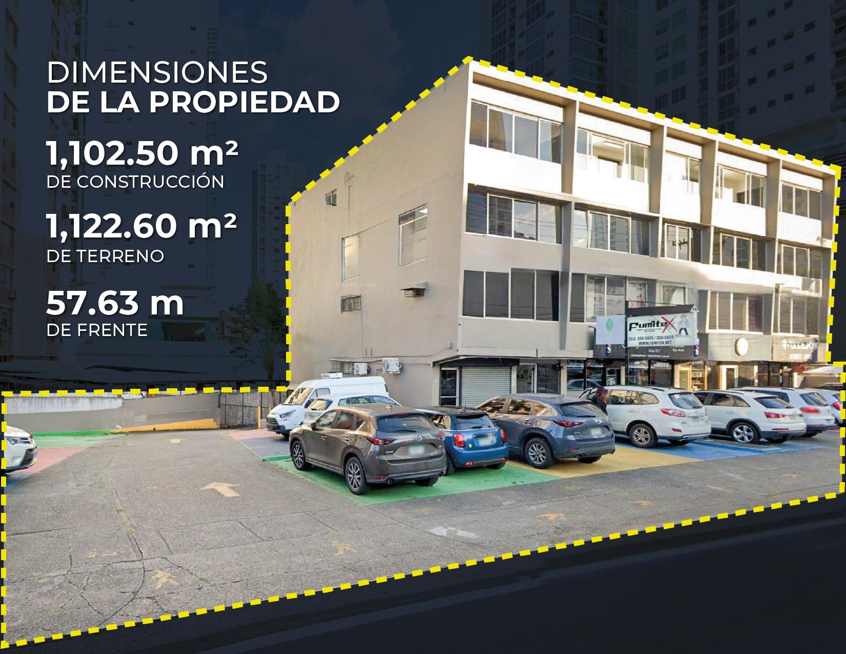La propiedad ofrece una excelente visibilidad ya que esta ubicada justo detrás de la casa de las baterías de Vía Porras y a solo 25 metros del Parque Omar, cerca de bancos, restaurantes, y otros comercios Fácil acceso desde Vía Porras y Calle 50 El edificio cuenta con: 12 Oficinas 4 Locales Comerciales en planta baja 2 locales comerciales en el Sótano 42 estacionamientos de visitas Área Pavimentada 800 m2